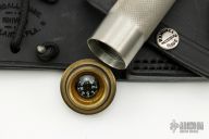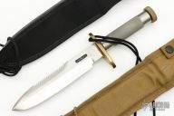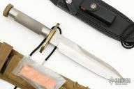 This Model 18-7.5 Attack Survival from Randall Made Knives has a 7.5" blade with sharpened top edge and sawteeth, .219" blade stock and 1.367" blade depth, hidden tang construction. The handle has a brass guard and knurled butt cap, knurled stainless steel handle. Compass in the butt cap. Comes with a black leather sheath, Randall zippered case, and an additional OD Green nylon sheath. Excellent condition.
