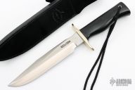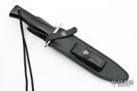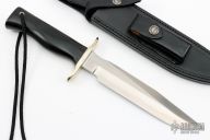 This Model 16 Special Fighter from Randall Made Knives has a satin finished stainless steel clip point blade with sharpened top edge, .213" blade stock and 1.251" blade depth, full tang construction. Handle has black linen micarta handle, nickel silver guard and lanyard tube. Stainless steel blade. Comes with black leather sheath and a Randall zippered case. Excellent condition.