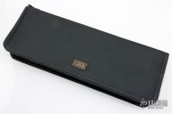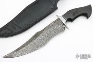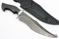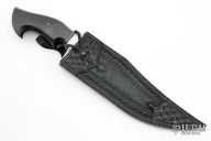 This Fighter by the Sobral Brothers features a San Mai Damascus blade with false top edge, .235" blade stock and 2.47" blade depth, hidden tang construction. The guard is stainless steel with a nicely figured carbon fiber grip, satin finished titanium spacer. Comes with a hand tooled black leather sheath and a leather zippered case. New from maker!