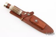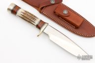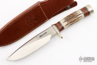 The Model 25-6 by Randall Made Knives is a drop point hunter similar to Model 11, but handle construction is reminiscent of 1930′s design. Excellent skinning, outdoors knife. This knife has a stainless steel blade with notched thumbrest, .206" blade stock and 1.355" blade depth, hidden tang construction. The handle nickel guard and pommel, stag grip with stacked leather, black and duralumin spacers. Comes with brown leather sheath and a Randall zippered case. Excellent condition.