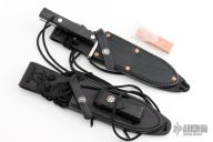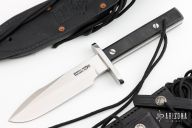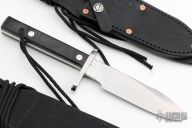 This Model 17 Astro by Randall features a satin finished spear point blade with false top edge, .217" blade stock. 1.263" blade depth, full tang construction. Black linen micarta scales, fastened with removable stainless steel bolts. A slot in the heavy tang and matching hollow inside the handle may be used to carry matches, fishhooks, line and other survival items. The Model 17 was especially designed for the seven Mercury astronauts, who carried them on America's first manned space flights. Astronaut Gordon Cooper did the final design, and two of these historically valuable knives are on display in the Smithsonian Institution. Includes black leather sheath with stone, black leather sheath with copper rivets by Gutcher at Sullivans, and a Randall zippered case. Excellent condition.