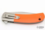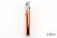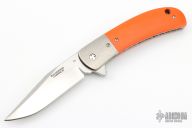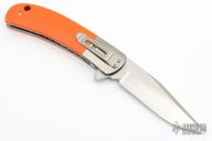 This Classic flipper from Phil Boguszewski features a hand rub satin finished blade with notched flipper. The handle has jeweled titanium liners, orange G-10 scales, orange peel finished titanium bolsters, and a satin finished pocket clip that is positioned for tip down carry. The backspacer is black linen micarta. The blade is centered when closed. Flips like you'd expect a Boguszewski to flip- effortlessly! Locks up with no play and has nice crisp detent. This rare piece is in excellent condition and shows no signs of use or carry. Comes in a Velcro belt sheath.