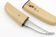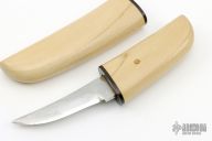 This small utility features a San Mai Damascus blade with .137" blade stock and .760" blade depth, hidden tang construction. Has a wooden handle with matching Saya. Excellent condition.