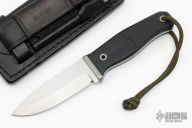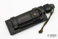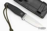 This knife by Rob Bayley features a hand rubbed satin finished blade.  .146" Blade Stock.  1.202Blade Stock. The handle has black G-10 scales with a bead blasted titanium guard with a full tang construction. Includes a black leather sheath set up for horizontal carry, with a fire starter.  Has been resharpened. Light scratches are visible otherwise the knife is in excellent condition.