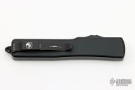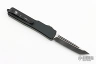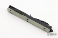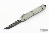 This UTX-70 OTF automatic by Microtech features a tanto blade with a standard edge. The handle has a Jade Green G10 top and a black aluminum bottom with black stainless steel tip down clip. Comes with box & original papers. Has some scuffs, otherwise excellent condition. Dated 10/2021 and #316