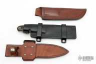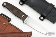 This knife by Rob Bayley features a satin finished drop point blade with a full tang construction.  .206" Blade Stock.  1.462 Blade Stock. The handle has micarta scales with a titanium guard. Includes three leather sheaths.  Light scratches are visible otherwise the knife is in good condition.