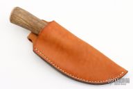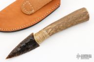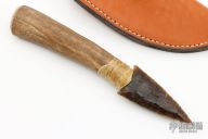 This knife has a knapped flint blade that is approximately .400" thick and 1.242" blade depth. The blade is attached to the stag handle with sinew wrap. Comes with a brown leather sheath. Excellent condition.