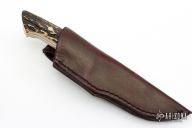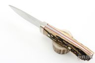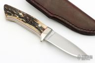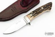 This drop point hunter by Phillip M Parris features a mirror polished blade with .195" blade stock and 1.058" blade depth, full tapered tang construction. The handle has a nickel silver guard, presentation grade stag scales with red liners and nickel silver pins. Comes with a maroon leather sheath. New from maker.