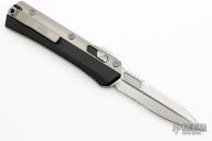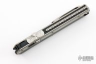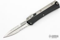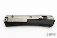 This Glykon by Microtech features a stonewashed double edged blade with fullers and notched thumbrest. The handle has a black aluminum chassis with bead blasted titanium overlays and tip down clip. Comes with original box and papers. Excellent condition. Dated 03/2023 and #526
