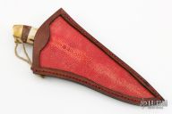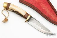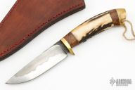 This Hunter by Last Knives features a nice hamon, .183" blade stock and 1.011" blade depth, hidden tang construction. The handle has a brass guard, stag grip, brass butt with lanyard hole, brass and teak burl wood spacers. Comes with a brown leather sheath with stingray skin inlay and COA. New from maker.