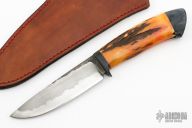 This Hunter by Last Knives features a nice hamon, .209" blade stock and 1.084" blade depth, hidden tang construction. The handle has a buffalo horn guard and butt, stag grip. Comes with a brown leather sheath and COA. New from maker.