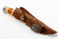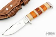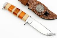 The design is a clip point that is very similar to his "My Knife", a drop point design that has been popular from very early in D's career as one of America's outstanding Knifemakers. The handle is all D'Holder. The narrow tang with alternating materials has been his trademark for years, with those made with Oosic and Amber probably being the most popular. They certainly have been with A. G. Russellâ„¢ customers. This handsome hunting knife has a 4-1/4" blade of 9Cr18Mo hardened to 58-60 Rc. The handle is dressed with alternating rounds of Faux Amber and Faux Oosic, separated with spacers of red fiber and brass. The stainless guard and butt match the fantastic polish on the perfectly ground blade. The tooled leather sheath is an excellent copy of D's original. Made in Taiwan.
