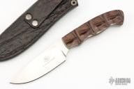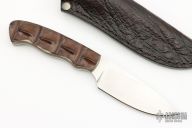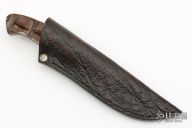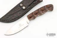 This "Croc" by Arno Bernard is part of the "Predator" series of knives. This piece has Crocodile skin handle scales with brown G-10 backing. Hand rubbed satin finish blade with .140" blade stock and 1.221" blade depth, full tapered tang construction. Includes a brown leather sheath.  Excellent Condition.