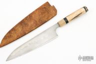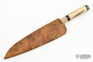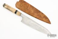 This Gyuto by Last Knives features a hand rub satin finished blade with nice hamon, .117" blade stock and 1.764" blade depth, hidden tang construction. The handle has an antler guard , buffalo horn spacer, stag grip, sheep horn butt. The saya is teak wood burl. New from maker.