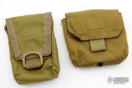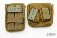These vintage pouches by TAD Gear. The larger pouch is approximately 4.5"x4". Has an interior pocket, drain hole, and velcro attachment loops. The other pouch is approximately 5"x3.25". This pouch has a rigid backing velcro and molle velcro attachment straps. Excellent condition.