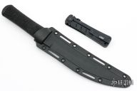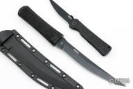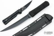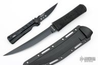 This Hissatsu Fixed Blade has a black finished upswept blade with hidden tang. 3/16" blade stock, 15/16" depth. Handle is molded GFN. Comes with a black molded sheath. Excellent condition.