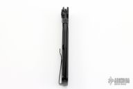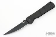 This Williams Otanashi noh Ken Framelock Folder has a black finished AUS-8 upswept blade with thumb disk. Handle is black G10 and black finished stainless steel with reversible tip-up clip, landyard hole, and black fiber backspacer. By moving a thumb button at pivot thumbrest, this knife becomes a fixed blade by locking the lockbar onto the tang. Centered blade, excellent lockup and detent. This is an extremely robust folder with a very slim profile. Makes for a great larger-than-average EDC piece. Good condition; just a few light scuffs.