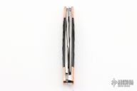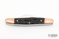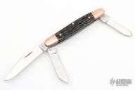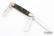 This Stockman from Ka-Bar features polished blades with nail nicks. The handle has copper bolsters and pommel with black jigge scales over stainless steel liners and springs. Has some light scratches, otherwise good condition.