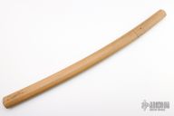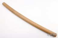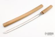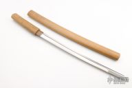 This Wakizashi features a polished blade with fullers, it appears to have a slight pattern in the blade, don't know if it is folded steel or not, .235" blade stock and 1.154" blade depth. The handle and saya are matching wood. The blade has no markings on the tang. Nice and sharp. Has some dings scratches on the wood, otherwise good condition.