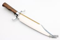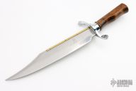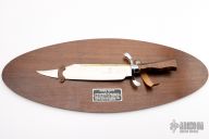 This knife by Carvell Hall is in honor of Colonel James Bowie (1799-1836), it features a mirror finished clip point blade with false top edge and brass parry guard, .171" blade stock and 1.749" blade depth, hidden tang construction. It has a chrome plated guard with a wooden grip. Has a couple scratches, otherwise good condition. Comes with wooden display plaque, one of the leather straps is cut.