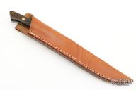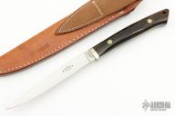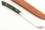 This Small Fillet Knife by G Sakai features a mirror polished blade with .076" blade stock and .566" blade depth, full tapered tang construction. The handle has a nickel silver guard, black linen micarta scales, lanyard hole at the butt. Comes with brown leather sheath. Excellent condition.