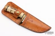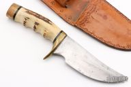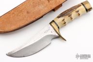 This Skinner by Clyde Fischer features a satin finished blade, .243" blade stock and 1.740" blade depth, hidden tang construction. The handle has a brass guard and butt and a stag grip with finger grooves and black spacers. Comes with a brown leather sheath with belt loop. Has scuffs and scratches, has patina, has been used and resharpened, otherwise good condition for its age.