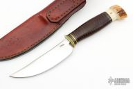 This Scagel Style Hunter by Lyons (please let us know if you know this makers full name) features a hand rub satin finished blade with visible temper line, .155" blade stock and 1.146" blade depth, hidden tang construction. The handle has a brass guard, stacked leather grip, stag butt with mammoth ivory inlay, black/brass/copper spacers. Comes with a hand tooled brown leather sheath. Has a couple of scratches, otherwise excellent condition.
