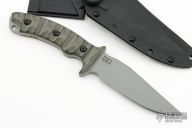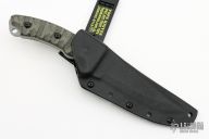 This knife features a cerakoted blade with a full tang construction. .196" Blade Stock. 1.264" Blade Depth. The handle has green micarta scales. Includes a black kydex sheath. Excellent Condition.