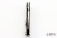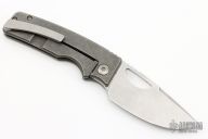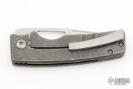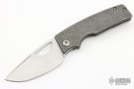 This knife by the OZ Machine Company features a stonewashed Z-FiNiT blade with a false top edge, thumbhole and notched thumbrest.  The handle features a smooth stonewashed titanium frame with a titanium tip up pocket clip and backspacer.  Includes box and COA dated 7-21-21. Excellent condition.