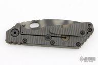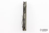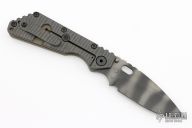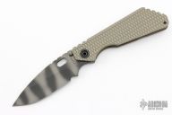 This SMF framelock folder by Mick Strider features a tiger striped drop point blade and a dimple pattern bronze aluminum and flamed titanium frame and tip up titanium clip. Includes a "Lock Bar Stabilizer" for maximum reverse lock retention. Nice detent, lockup and blade seating. New condition.