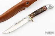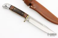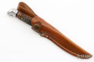 This knife by Western Cutlery features a satin finished blade with fullers, .107" blade stock and .783" blade depth, full tang construction. The handle has a brass guard, jigged scales, black/white/red spacers and an aluminum butt. Comes with a brown leather sheath. Blade stamped "WESTERN U.S.A. 648A". Has some light scratches, otherwise excellent condition.