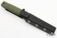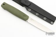 This knife features a satin finished drop point blade with a mortis tang construction. .121" Blade Stock. .845" Blade Depth. The handle features G-10 scales and liners. Includes a kydex sheath. Excellent Condition.