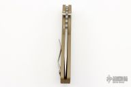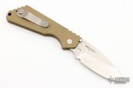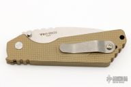 This collaboration between Protech and Strider features a tumble finished blade with notched thumbrest. The handle has a tan aluminum frame with a tumbled stainless tip up clip. Has safety. Comes with original box and papers. New condition. PR2 #690