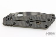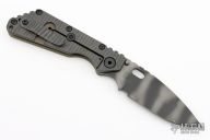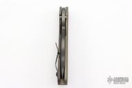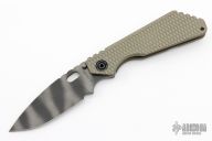 This SMF framelock folder by Mick Strider features a tiger striped drop point blade and a dimple pattern bronze aluminum and flamed titanium frame and tip up titanium clip. Includes a "Lock Bar Stabilizer" for maximum reverse lock retention. Nice detent, lockup and blade seating. New condition.
