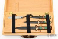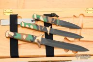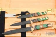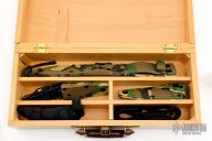Model# 5897 - Camouflage Guardian Kit - Hardwood storage chest, Guardian, Guardian I and Guardian II all with camouflage handles and matching camouflage scabbards, Sharpening Steel and black harness assemblies. (See models# 5801, 5676 and 5776 for specifications.)