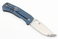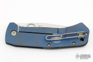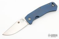 This Slysz Bowie by Spyderco features a tumble finished blade with notched thumbrest and thumbhole. The handle has a blue anodized titanium frame with notched black G-10 backspacer and tip up, left or right reversible clip. Nice detent, lockup and blade seating. Includes the original box and papers. Knifejoy Edition. New condition.