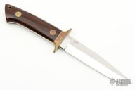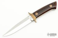 This Loveless Style Wilderness (please let us know if you recognize this maker) features a mirror polished blade with two nearly sharpened edges (it was never final sharpened), .176" blade stock and .989" blade depth, full tapered tang construction. The handle has a brass guard and pins with cocobolo scales and white liners, lanyard hole. Has some light scratches, otherwise excellent condition.