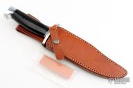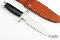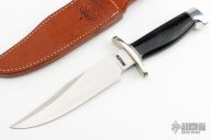 This "Nordic Knives Special Bowie" was made by Randall and originally sold by Nordic Knives. .221" blade thickness and 1.366" blade depth, sharpened top edge, hidden tang construction. The handle has a nickel silver forward curved hilt, black linen micarta grip with black and duralumin liners, dualumin crow's peak butt. #258 on back side of blade. Comes with a brown leather sheath and a Randall zippered case. Excellent condition.