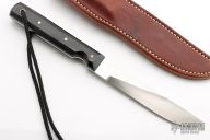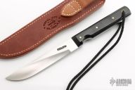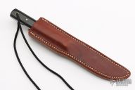 This Model 10 Salt Fisherman and Household Utility features a satin finished upswept blade with notched thumbrest, .113" blade stock and .861" blade depth. The handle has black linen micarta scales with brass pins over full tang construction. Brass lanyard tube with lanyard in pommel. Includes a brown leather sheath and a Randall zippered case. Excellent condition.