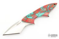 This DogTag by Jerry Hossom features nicely shaped turquoise scales with red liners and brass and mosaic pins. Hand rubbed satin finished blade with notched thumbrest, .158" blade stock and 1.337" blade depth, full tapered tang construction. Fits nicely in hand. Includes a zippered case. Excellent condition.