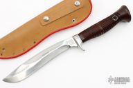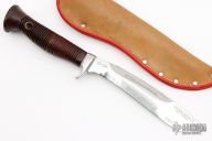 This vintage Sea-Hunter by Puma Knives was made for Abercrombie & Fitch Co, it features a recurved drop point partially serrated blade with sharpened top edge and notched thumbrest, .185" blade stock and 1.085" blade depth. The handle has an aluminum guard and ribbed rubber handle with lanyard tube and leather lanyard over hidden tang construction. Includes original leather sheath with belt loop. Has some scratches, otherwise good condition for its age.