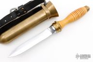 This is a handsome and traditional piece of equipment manufactured to rigid U.S. Navy specifications originally set down in the 1929 Hull Standard Plan Drawing and cherished by Navy and commercial divers throughout the world. It has a 7" stainless steel blade with a clear Maple handle. The knife screws into the top 1/2" of the cast brass sheath using Acme threads which not only hold it securely in the sheath but also permit it to be easily and quickly removed. The upper edge of the knife blade is cut with saw teeth while the lower edge is a conventional knife edge. The belt strap is top grain leather. It is as much sought after by collectors for its unique design and appearance as by divers for its utility underwater. Has a little patina, otherwise excellent condition.