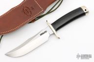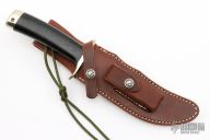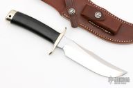 This model 4F by Randal Made Knives features a satin finished blade with a sharpened top edge, .198" blade stock and 1.379" blade stock, hidden tang construction. The handle has a nickel silver double guard and butt with lanyard hole, black spacers, and a black linen micarta grip. Comes with a brown leather sheath. Excellent condition.