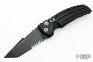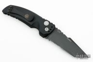 This EX-A01 by Hogue Knives is an Allen Elishewitz design, it features a black tanto partially serrated 154CM blade with notched thumbrest. The handle is black aluminum, tip up or down reversible black stainless steel clip. Has safety. Comes with Hogue box and papers. New condition.