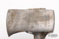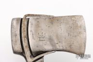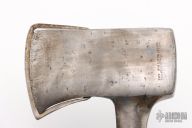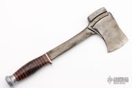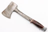 This Cattaraugus Indestructible Axe has patina and some small dings in the edge, has correct swing guard, has wear on the finish. The handles are stacked leather and colored spacers. Aluminum guard and butt. Has scuffs and scratches throughout. Good condition for its age.