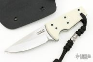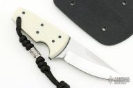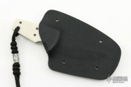 This knife by David Lancaster Clark features a satin finished blade with a full tang construction, .161" Blade Stock.  1.063" Blade Depth.  The handle features white G-10 scales over black G-10 liners. Includes a lanyard with a silver bead and a kydex sheath.  New from maker!