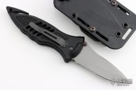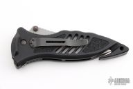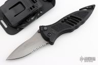 This CQD Mark 1 Auto from Masters of Defense has a spear point bead blasted blade with dual thumb studs and serrations. Handle is black aluminum with non-slip inserts, reversible black tip down clip, seat belt cutter, lanyard hole and glass breaker. Has some light scuffs, otherwise excellent condition. Comes with original box, sheath and papers.
