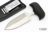 This Terminator Push Dagger by Cold Steel has a satin finished double edged blade with fullers and hidden tang, .186" blade stock, 1.324" depth. Handle is non-slip polymer. Excellent condition. Comes with a black leather sheath with clip. This was made in the 1980s