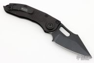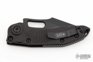 This Stitch Auto by Microtech Knives features a DLC finished blade and false top edge, notched thumb and finger rests. The handle has a black anodized and milled aluminum handle with a DLC titanium backspacer, DLC stainless steel hardware and clip, tip up carry, lanyard hole at the butt. Comes with original box and papers. S/N 12265 and dated 03/2023. Has some gunk on the blade, and a couple of scuffs on the handle. Excellent condition otherwise.