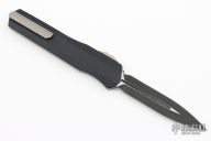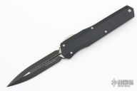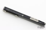 This Cypher OTF is a collaboration between Anthony Marfione and DC Monroe. It features a black double edged blade with satin flats and notched thumbrest. The handle has a black anodized aluminum handle with blasted hardware, and a titanium tip down clip and a titanium insert at the butt. Comes with original box and papers. Has a couple light scuffs, otherwise excellent condition. 06/2018 and #2464.